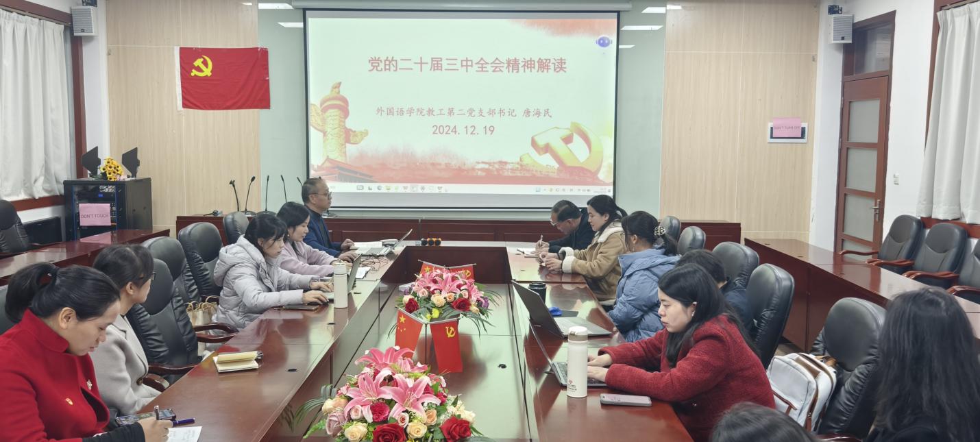 12月19日中午第二行政楼308室,beat365平台官方网站教工第二党支部书记唐海民以“学习党的二十届三中全会精神 进一步全面深化改革、推进中国式现代化”为主题,为支部全体党员讲授学习贯彻党的二十届三中全会精神专题党课,支部全体党员参加。