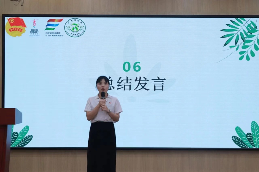 陈丽珊分享自己下乡时的经历,并表示希望各位队员们在下乡过程中能够注意个人安全、遵守团队纪律,在下乡期间锻炼自己的个人能力。蔡文蝶再次强调了活动期间的注意事项,希望大家能够以实干的精神来对待每一项工作,以有效的沟通来解决团队中的问题,以良好的态度展现阳光展翅实践团的精神风貌和以“争优”的动力开展2023年暑期“三下乡”社会实践活动。