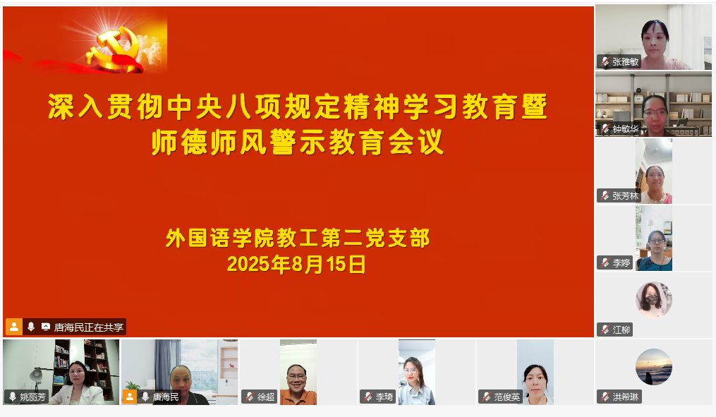 为持续开展深入贯彻中央八项规定精神学习教育,进一步强化师德师风建设,beat365平台官方网站教工第二党支部于8月15日通过腾讯会议平台召开师德师风警示教育会议。会议由党支部书记唐海民主持,支部全体党员参加。