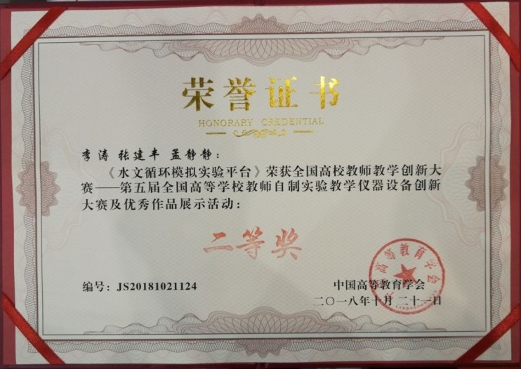 304永利集团官网入口(水利水电国家级实验教学示范中心)积极响应,充分发挥在自制实验仪器设备方面的传统优势,选送的两个参赛项目获奖,取得优异成绩。其中,“水文循环模拟实验平台”(李涛、张建丰、孟静静)获得二等奖,“水文水资源虚拟仿真实验教学系统”(解建仓、罗军刚、魏娜、张晓、汪泥)获得三等奖。西安理工大学共有5个项目参加决赛,获得1个二等奖,4个三等奖,并获得团体奖,是参加该项赛事以来的最佳成绩。