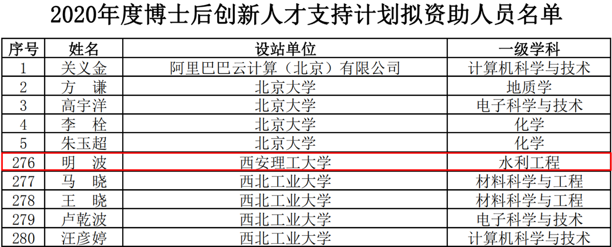 博士后创新人才支持计划,简称“博新计划”,是人力资源和社会保障部、全国博士后管委会新设立的一项青年拔尖人才支持计划,旨在加速培养造就一批进入世界科技前沿的优秀青年科技创新人才,是我国培养高层次创新型青年拔尖人才的又一重要举措。“博新计划”结合国家实验室等重点科研基地,瞄准国家重大战略、战略性高新技术和基础科学前沿领域,每年遴选400名应届或新近毕业的优秀博士,进入国内博士后设站单位从事博士后研究工作,国家给予每人63万元的经费支持。此次全国400名入选者中来自水利工程学科的仅5名,西安理工大学、清华大学、304永利集团官网入口、大连理工大学、河海大学各获选1名。