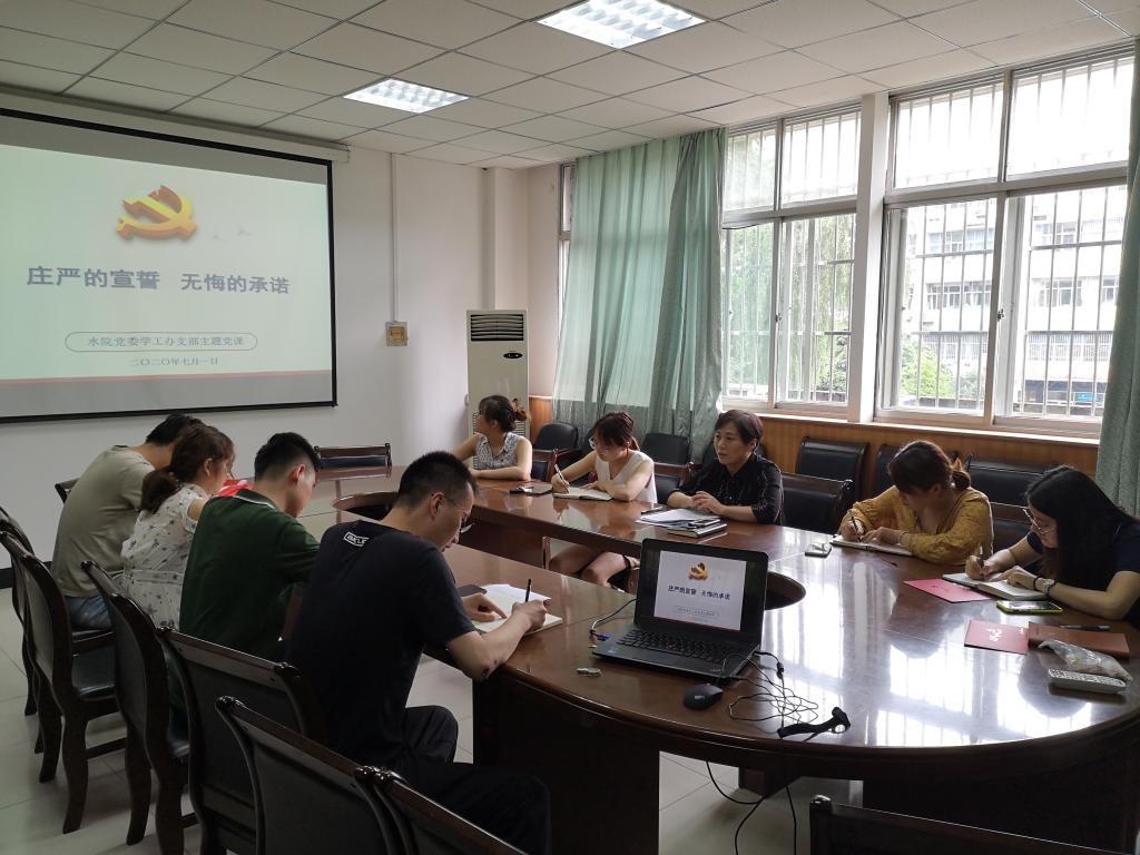 7月1日下午,304永利集团官网入口学工办党支部在教四楼207会议室开展了题为“庄严的宣誓、无悔的承诺”的主题党课学习。党课由院党委副书记、副院长李红英主讲,支部全体党员参加学习。