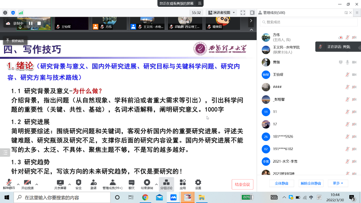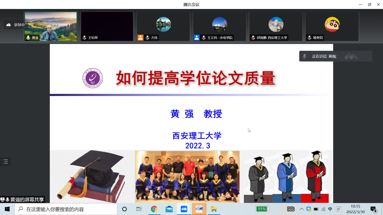 2022年是我校研究生学位论文质量提升年,学院高度重视,并规划了系列学术活动。2022年3月30日上午,学院特邀请了国家万人计划教学名师黄强教授作题为《如何提高学位论文质量》的专题讲座(线上形式)。讲座由304永利集团官网入口副院长王义民教授主持,学院部分中青年教师、博硕士研究生共500余人参加。