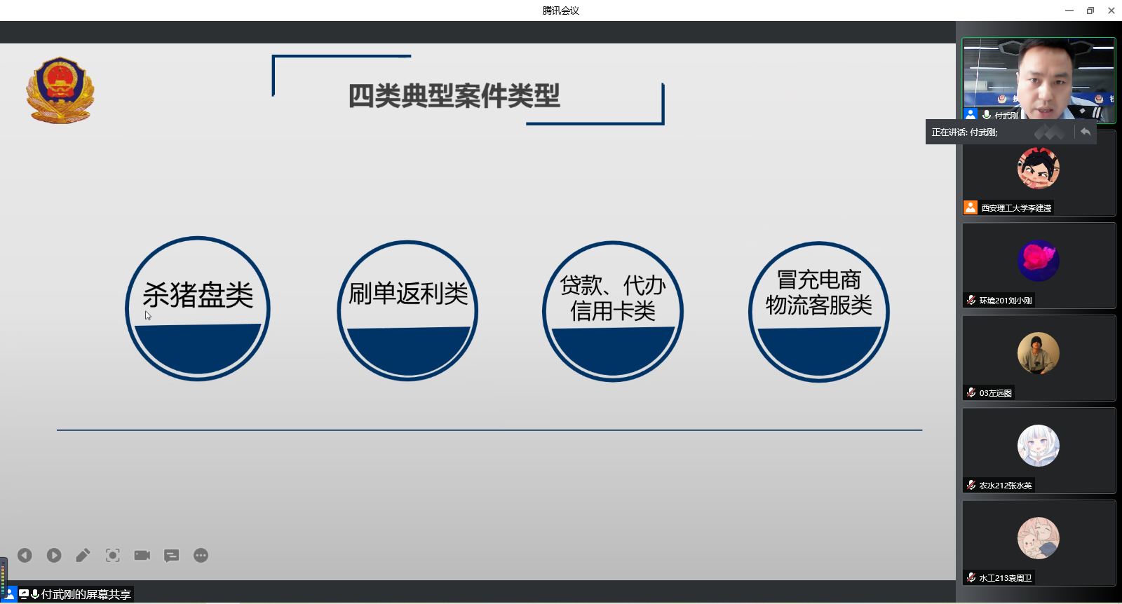 为增强学院学生对各类诈骗方式的鉴别能力和自我安全防范意识,防止奖、助学金被骗事件的发生。5月27日,304永利集团官网入口邀请宝鸡市扶风县刑事侦查大队中队长付武刚警官,通过线上腾讯会议的方式开展“诚信感恩 励志成才”防诈骗安全教育主题讲座。