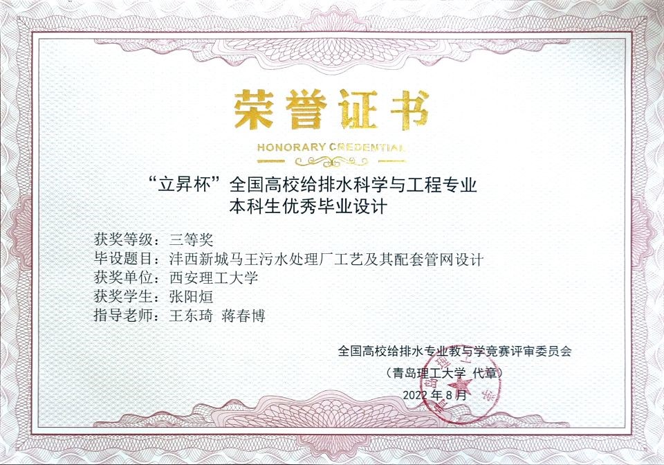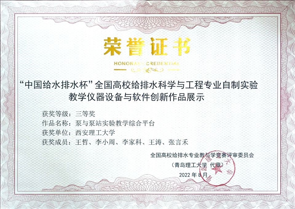 本次会议还进行了教指委优秀毕业设计、自制实验教学仪器设备与软件创新作品的评选。经专家评选,我校教师王东琦、蒋春博指导的毕业设计“沣西新城马王污水处理厂工艺及其配套管网设计”获得“立昇杯”全国高校给排水科学与工程专业本科生优秀毕业设计(论文)三等奖;王哲、李小周、李家科、王涛、张言禾等共同完成的“泵与泵站实验教学综合平台”获得“中国给水排水杯”全国高校给排水科学与工程专业自制实验教学仪器设备与软件创新作品展示三等奖。