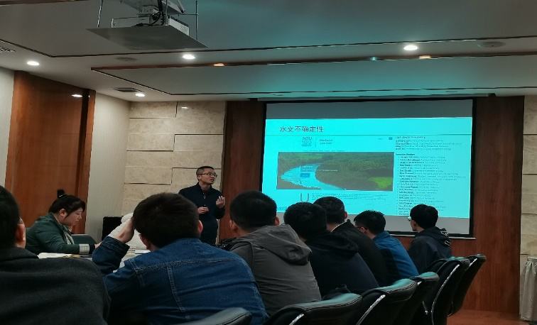 赵铜铁钢首先从水文不确定性的来源、定义等方面引出研究背景,随后讲解了预报不确定性的两种不同的建模思路,即面向过程建模和面向结果建模;通过洪水预报不确定性量化、降水预报校正、潜在蒸发预报等三个方面详细介绍了贝叶斯联合概率模型的应用;最后,赵铜铁钢对水文预报领域未来的发展方向作了展望。赵铜铁钢教授长期从事全球气象预报和流域水文预报等研究,通过精彩的学术汇报带领学生了解水文专业的前沿知识,增强了学生对水文专业的热爱和对行业未来发展的信心。