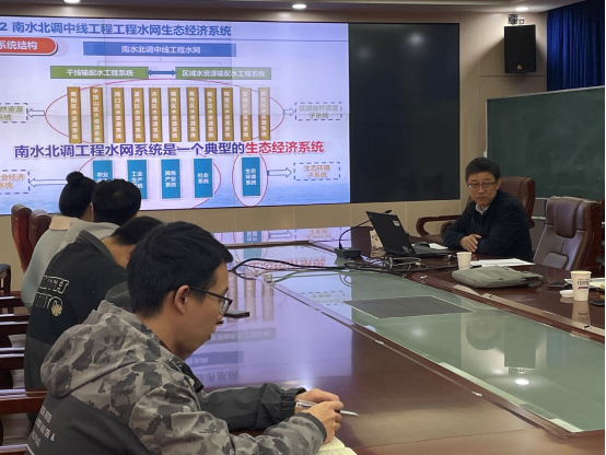 报告中,吴泽宁教授首先对南水北调工程水网系统的构成及特点做了详细介绍;随后,从水资源优化配置的概念、调水量协调分配模型构建和系统生态经济效益量化评估技术等方面介绍了省级分区调水量协调分配方案。然后从市级分区调水量与当地水资源联合优化调配整体思路、联合调配网络构建介绍了市级分区调水量与当地水资源联合优化调配方案。最后阐明了基于水权交易的分区间调水量动态调整的必要性和实现各级分水方案动态调整的有效途径。汇报结束后,吴教授还与现场的师生进行了积极互动,对师生提出的问题作了详细解答,增强了师生对南水北调工程水网系统水资源优化配置技术与方法的认识。