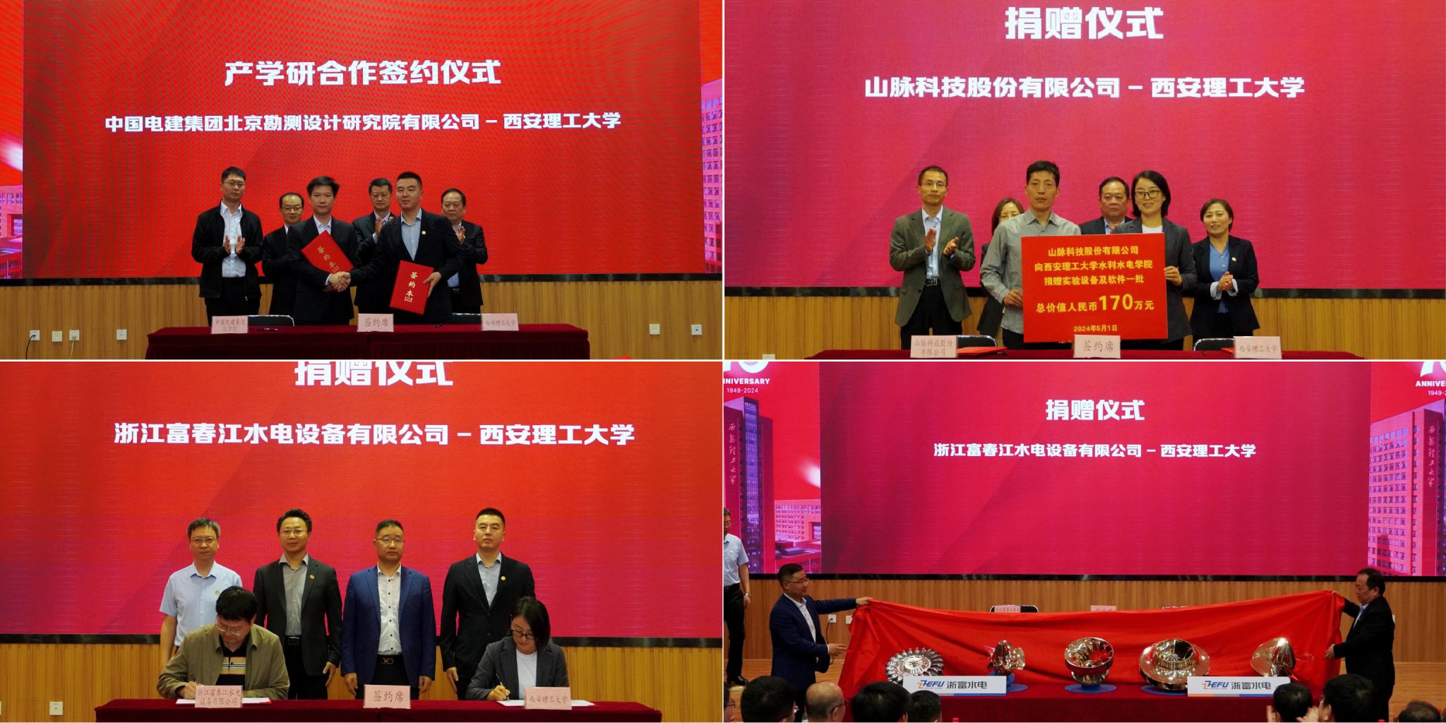 校企合作促发展,共建共赢谱新篇,本次会议上永利官网与多家友好企业推进了深层次的合作与共建。中国电建集团北京勘测设计研究院有限公司与永利官网签订了产学研合作协议,大禹节水集团股份有限公司、山脉科技股份有限公司和浙江富春江水电设备有限公司向学院捐赠了共计498.83万元的科研设备。西安理工大学水利水电建筑勘测设计有限公司总经理杨杰从公司历史沿革、组织架构、业务范围、资质与业绩、发展与愿景等方面进行合作推介。校企双方将持续在项目合作、人才培养、专业建设等方面实现互利共赢。