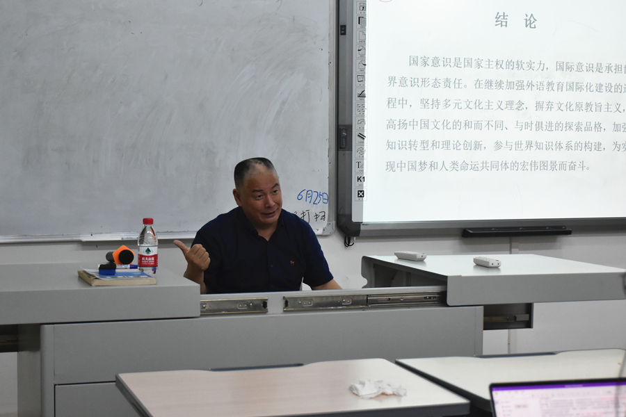 杨枫就外语教育国家意识话语建构的研究目标和研究内容进行了全面的介绍。他强调,理论话语体系构建的关键是要剖析国家意识的价值属性,结合外语学科特点界定外语教育中“国家意识”的话语表征。他指出,实践话语体系构建要注重“国家意识”和“课程思政”的同一性和同构性,要揭示文化遮蔽、文化锁定和文化装饰等价值性疏离问题,要突出外语教育中教师本身的施动行为。杨枫根据自己丰富的经验,提出了“三贵铸教”、“三德铸魂”、“三为铸人”和“三全育人”的教学实践原则,呼吁在座青年教师讲好中国故事,传播中国声音。