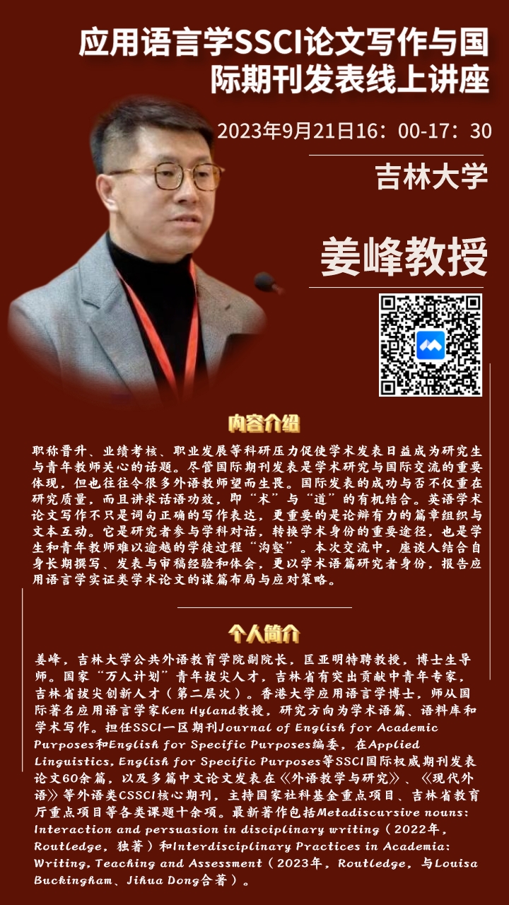讲座中,姜峰不仅分享了他在学术写作和国际发表方面的丰富经验和独到见解,更从学术语篇研究者的角度,深入剖析了应用语言学实证类学术论文的写作原则、结构布局和应对策略。他介绍了应用语言学实证研究论文的“沙漏型”特定结构,以及其与一般类型写作的七大特征,详细讲解应用语言学领域主流学术期刊各自的特点、喜好与受众,并通过大量的实证案例介绍论文投稿、发表中的期刊意识和读者意识。