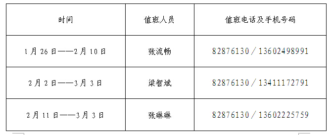 2、值班时间:上午8:30——11:30 下午2:30——5:30