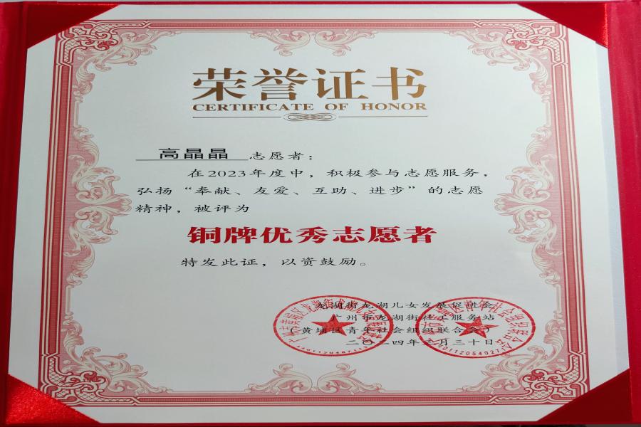 队员高晶晶荣获铜牌志愿者