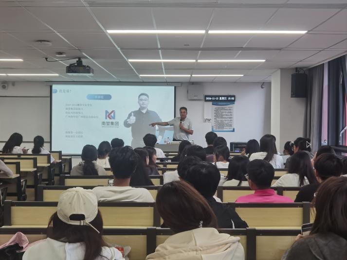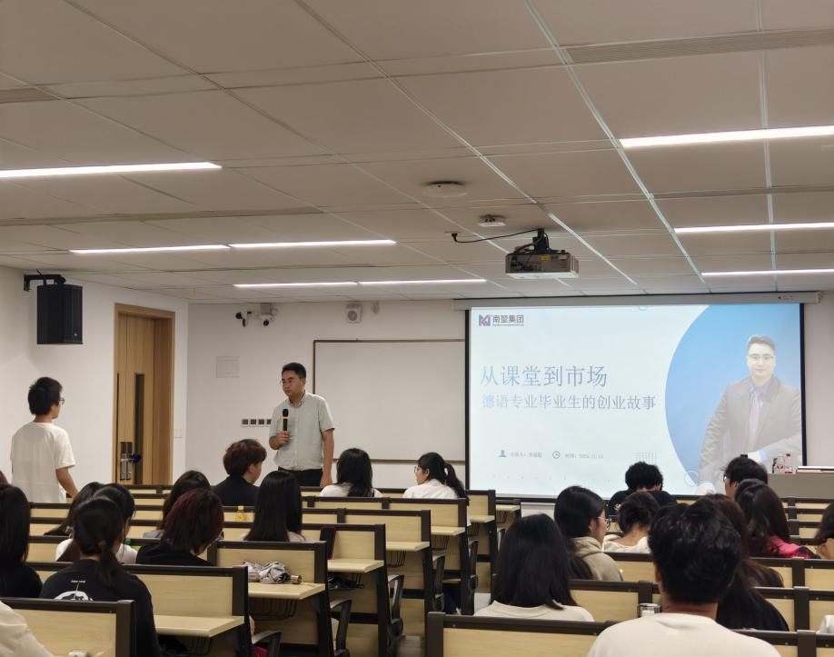 为进一步拓宽学生的职业视野,增强德语专业学生对未来职业规划的认识,帮助其更好了解德语专业的职业发展方向,beat365官网德语专业于11月13日下午邀请了校企合作单位南堃集团创始人、德语专业优秀校友李嘉聪进行创业故事分享。讲座由beat365平台官方网站德语专业教师周婷主持,24级德语专业学生参与了本次活动。