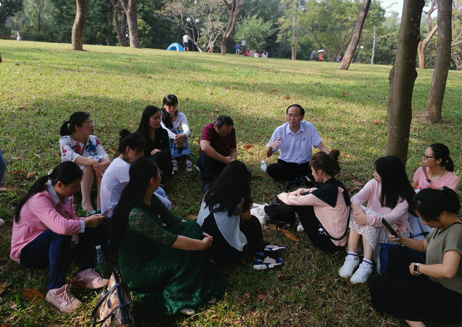 之后,在莲花山花草摇曳、蝴蝶纷飞的漾日湖畔,党员们席地而坐,开展了一场别开生面的“不忘初心、牢记使命”主题教育学习交流会。徐超致开场词,表明本次深圳之行是我们开展主题教育中“读原著、学原文、悟原理”的重要环节,第一阶段学院各支部在“读、学”环节做得比较好,但是知行须统一,今天来到深圳就是要强化“悟”的环节,在中国改革开放的起点,聆听这四十年的风云变幻,感受中国40年的沧桑巨变,极大地加强了我们对原著、原文、原理的理解,更加坚定了对中国共产党的信心和信念,是一次宝贵而有意义的学习机会。紧接着每位教工党员依次发言,党员们结合主题教育实际,从教书育人的角度畅谈作为教工党员如何在这个只有进行时没有完成时的改革浪潮中发挥先进性。唐海民认为,作为一名20多年党龄的老党员,主动将个人融入改革开放的大潮中发挥出自己的先锋模范作用既是党性要求,也是个人发展的必然要求。罗玉玲对“幸福都是奋斗出来的”这句话最有感触,作为一名教工党员,上好每一节、教好每一位学生、改好每一份作业就是奋斗,幸福自然油然而生。姚丽芳指出,咬住青山不放松,在教学、科研中践行“螺丝钉”的钻研精神对于当前教工党员提升教学质量、科研水平具有重要意义。章睿霖认为,坚持深入学生、指导学生要创新方式方法,教工党员要从以前的“蜡烛精神”向“LED灯精神”转变,始终照亮学生的成长成才。徐超对学习交流会进行了总结,他鼓励各位教工党员从自身岗位出发,将主题教育与教学、科研与学校的评估结合起来,发挥党员的先锋模范作用,不断发展和提高自己,以更饱满更积极地姿态为人民服务。