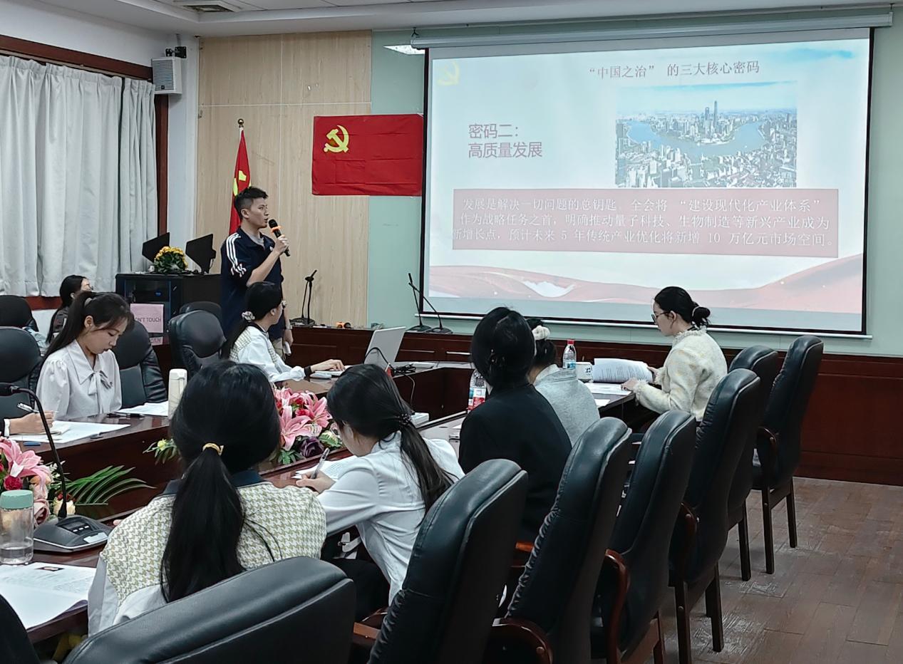 陈震枫首先阐述了学习的时代坐标与支部使命。他指出,党的二十届四中全会审议通过《中共中央关于制定国民经济和社会发展第十五个五年规划的建议》,为“中国之治”绘就了新蓝图。他强调,作为以党员为核心的学生组织,学生党支部肩负着将全会精神转化为服务同学行动力的核心使命,要发挥“头雁效应”,连接“国家蓝图”与“校园实践”,引领青年在理解制度优势中增强认同,在参与实践中锤炼能力。