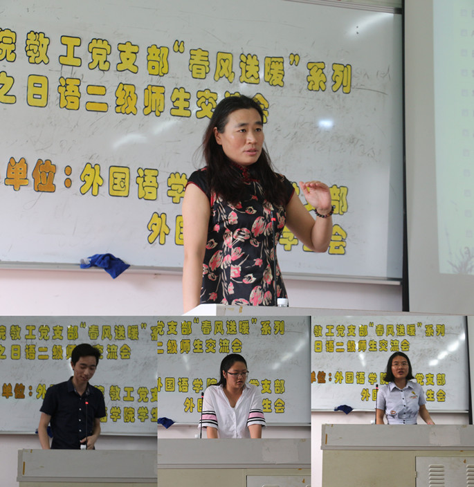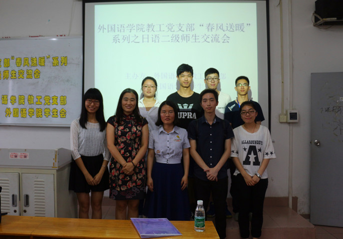 由beat365平台官方网站教工党支部学生会主办的 “春风送暖”系列活动之日语二级师生交流会” 于5月26日16:30在B301拉开帷幕。本次交流会面向14级日语专业的同学展开,外语系邓亚晔老师、优秀学生讲师团成员林碧娟、陈颖怡和陈嘉辉莅临现场为同学们备考日语二级传经送宝。