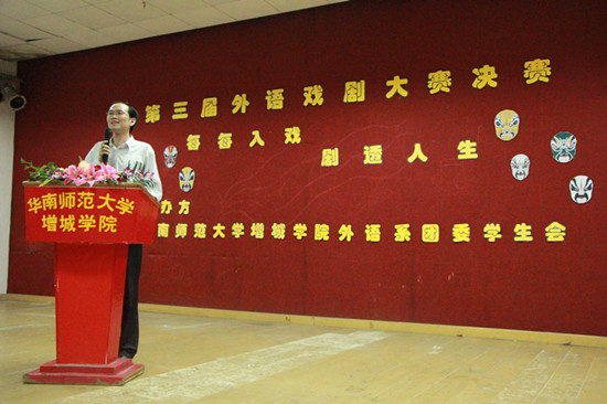 为深入学院落实“我为学风建设添光彩”各项活动,3月28日19:30,我系以“每每入戏,剧透人生”为主题的第三届外语戏剧大赛在A206隆重举行,我系党总支书记徐超,团委书记刘丽萍,团委副书记黄玉亭,10级辅导员刘万里,13级辅导员雷肖茹,学院及各兄弟系团委学生会学生干部出席了此次活动。本次大赛由英语老师蒙巧、毛文秀、张冰、外教Paul,日语老师邓亚晔、张烈、石桥谦一,德语老师童城、邓光远等9名专任老师担任评委。