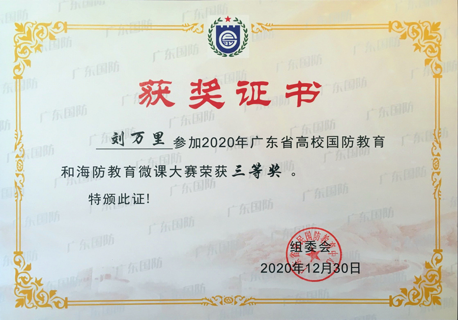 2020年12月29-30日,广东省高校国防教育和海防教育微课大赛决赛在潮州举办,beat365官网刘万里老师在决赛中凭借扎实的基本功、良好的教学素养、创新的教育理念和娴熟的授课技巧赢得了评委的认可,最终荣获三等奖,这也是beat365官网首次在该赛事中获奖。