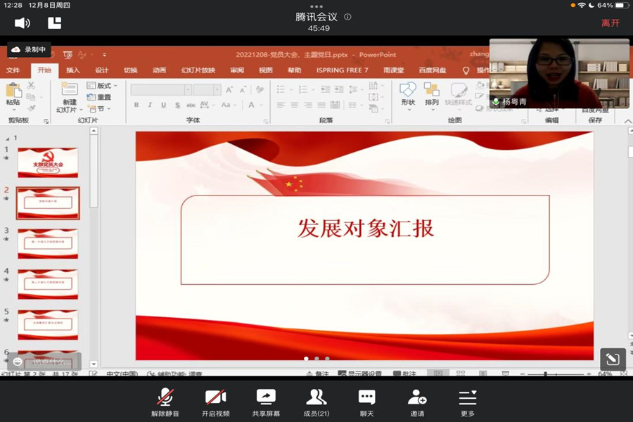 为了进一步加强基层党组织建设,落实党支部发展党员工作计划,12月8日,beat365平台官方网站教工第一党支部召开党员大会,就发展对象杨粤青同志能否吸收为预备党员事宜进行讨论和表决。大会采取腾讯会议线上会议的形式,由支部书记何瑞玉主持,严格按照程序开展。会议应到党员19名,实到党员18名,符合表决要求。