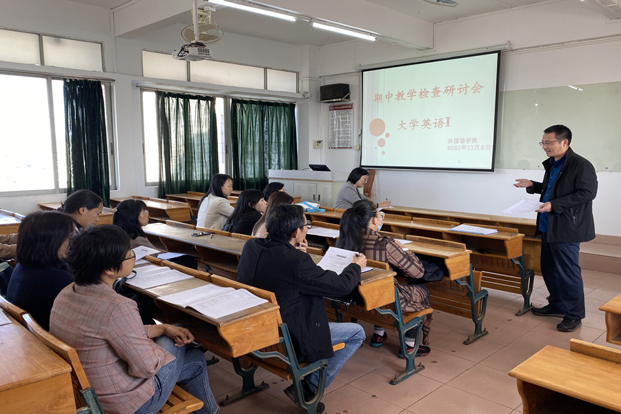 11月8日下午第六节课,beat365平台官方网站于三教605课室开展本学期第二场大学英语期中教学研讨课。校教务处董志邦、陈伟涛老师、督导王玉芝、beat365官网副院长袁鑫及部分大学英语教师参加了本次教学观摩及研讨。