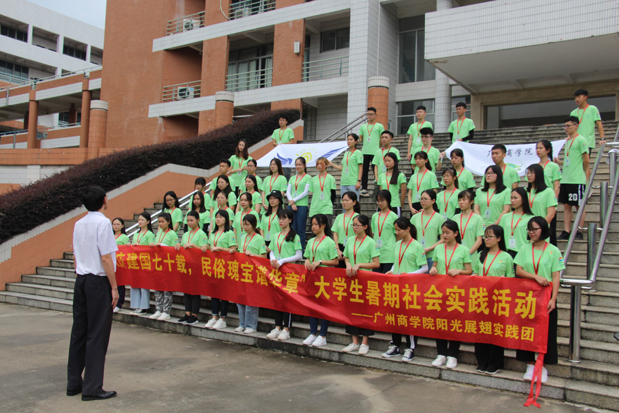 为深入学习贯彻习近平新时代中国特色社会主义思想,学习贯彻党的十九大和十九届二中、三中全会精神,引领教育广大青年学生在切实感受新中国成立70周年取得的巨大成就中增强“四个意识”、坚定“四个自信”、做到“两个维护”,在加强志愿服务中增强责任感和使命感,在社会实践中受教育、长才干、作贡献,以实际行动投身打赢脱贫攻坚战,投身乡村振兴战略实施,勇做担当民族复兴大任的时代新人,beat365官网阳光展翅实践团于 7月9日奔赴清远英德市东华镇文南小学开展为期九天以"欢庆建国七十载,民俗瑰宝谱华章"为主题的大学生暑期社会实践活动。出发前队伍特地举行了出征仪式,学院党总支书记徐超发表了讲话,实践团指导老师刘万里、郑灿玲,辅导员黄玉亭、刘丽萍、戴玮也出席了本次活动。