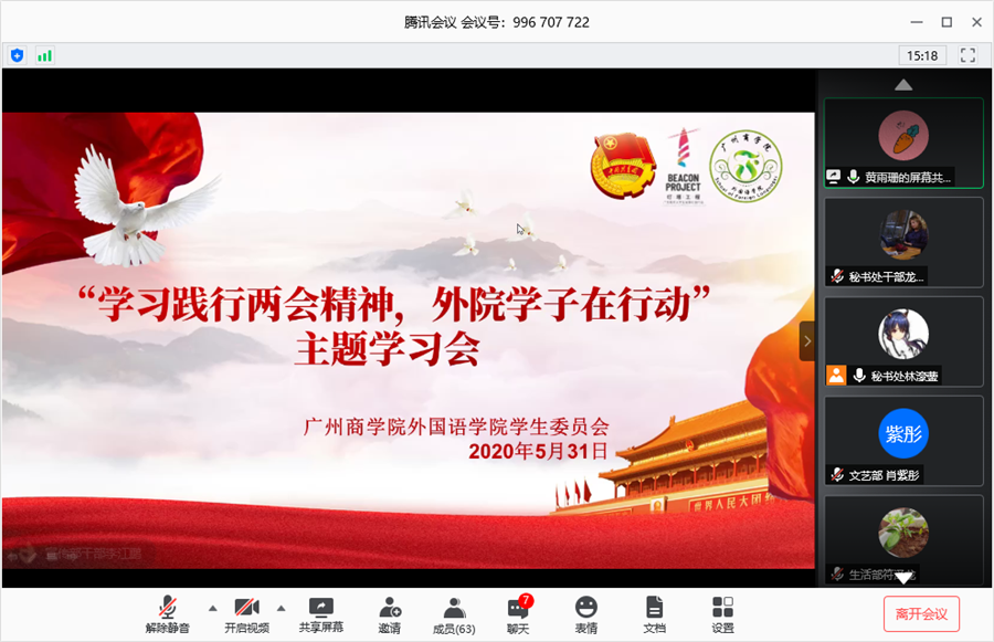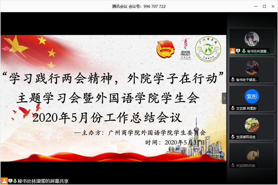 为深入学习宣传贯彻全国两会精神,引导beat365官网学生干部深刻领会两会的核心要义,同时展现beat365官网学生干部不忘初心做好本职工作的精神面貌,确保学生工作的有序开展,beat365官网学生会于5月31日15:00在腾讯会议平台上举行以“学习践行两会精神,外院学子在行动”为主题的学习会暨5月工作总结会议,出席本次会议的有学院党总支书记徐超,学院学生会指导老师伍思颖以及学院学生会全体干部。