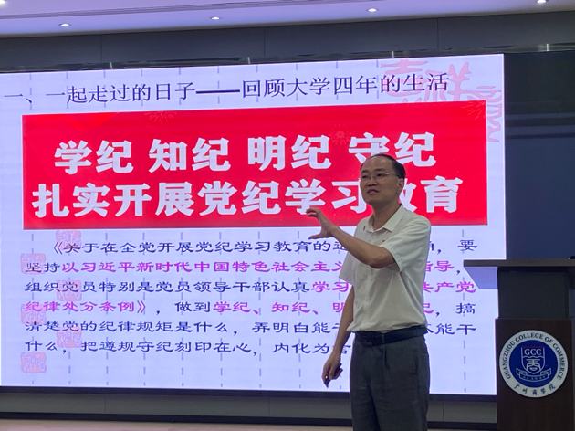 会议第二项议程,徐超书记以“扎实开展党纪学习教育”为目标,全面带领全体学生党员同志回顾大学四年生活。徐超指出,“广商永远是你的精神家园”,希望党员同志们能够总结经验教训,找到自己在学习、工作和生活中的不足之处,为自身发展提供有益的借鉴。