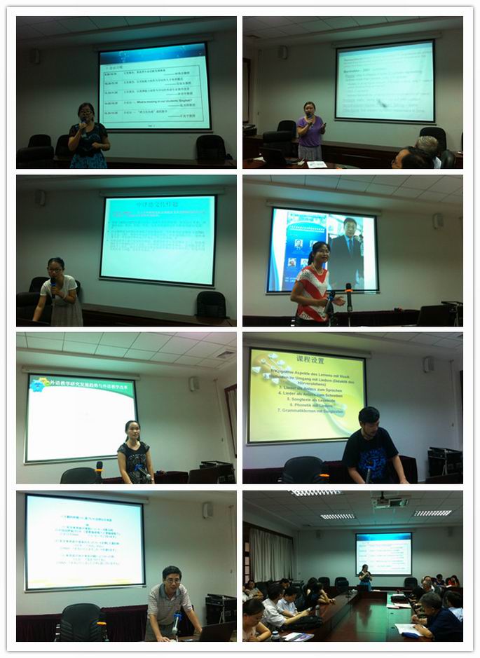 潘文晗参加“第五届多模态研究国际研讨会”,她向大家介绍多模态教学的发展与应用:什么是多模态、多模态研究如何运用实际当中、多模态教学如何与网络平台教学相结合。王均宜参加“外语教学定量研究中的统计方法”学术会议,向大家介绍用统计学中的研究方法、用数据统计软件来进行文本分析;根据数据类型的不同,要采用不同的数据分析方法。叶万琳参加“外语教学研究发展趋势与外语教学改革”研讨会,她向大家介绍上海外国语大学的陈坚林教授主持的讲座,包括教育的现代化、大学英语改革、语音研究的动向、计算机与外语教学的关系、外语教学研究课题的研究要点。