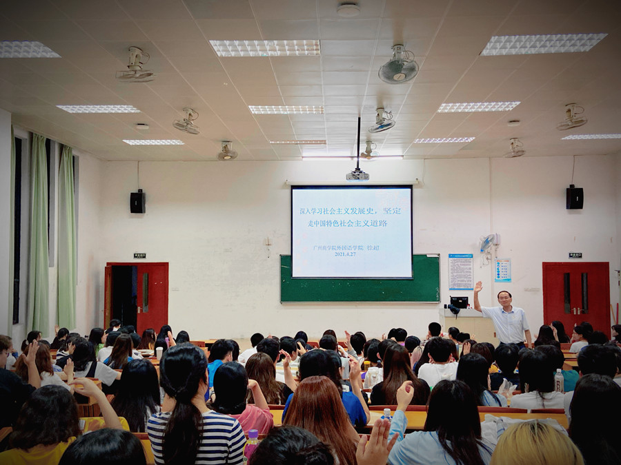 4月27日晚上,beat365平台官方网站2019级日语、德语专业全体同学在第四教学楼308教室举行了以“深入学习社会主义发展史,坚定走中国特色社会主义道路”为主题的书记第一课,主讲人为学院党总支书记徐超,辅导员谢清玲老师参与了本次活动。