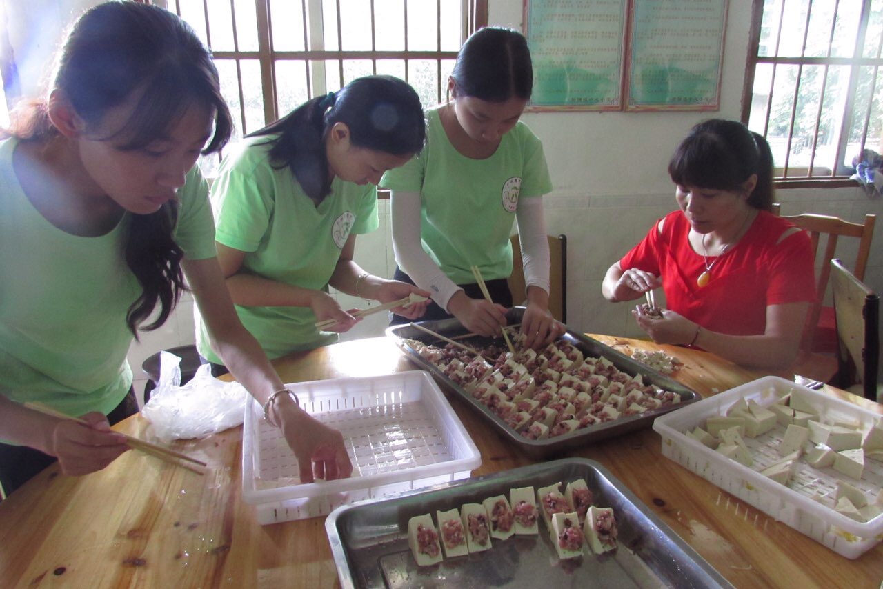 在阿姨的指导下,志愿者们在学习制作酿豆腐