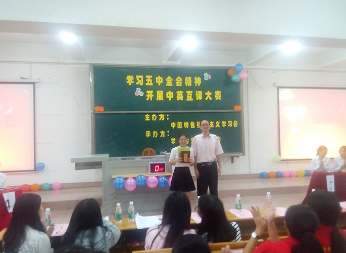 2015年11月20日星期五晚,中国特色社会主义学习会外语系分会于教学楼A107举行了以学习五中全会精神为主题的中英互译大赛决赛,出席本次决赛的有外语系党总支徐超书记,评委李卓华老师,校学习会副理事长黄晓玲,翻译协会会长张庆卫、副会长李嘉欣以及学习会外语系分会的全体干部。詹淑芝、梁志健分别担任中英文主持。