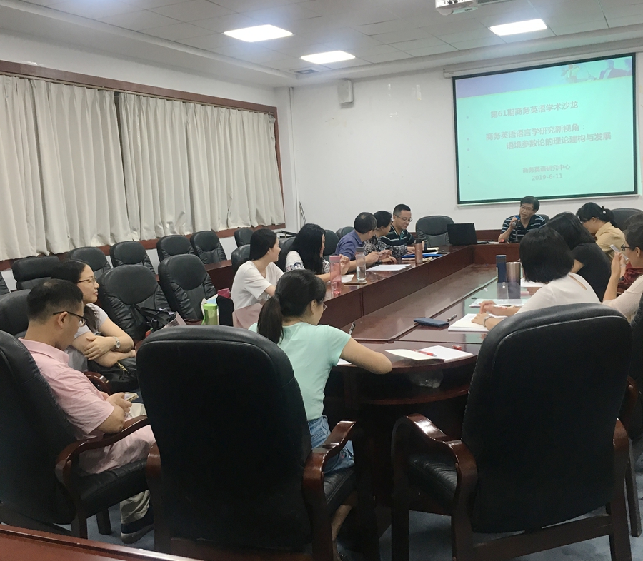 6月18日下午,第61期商务英语学术沙龙在beat365平台官方网站在第二行政楼308会议室举办。沙龙题目为“商务英语语言学研究新视角:语境参数论的理论建构与发展”。沙龙由商务英语学科带头人曾利沙教授主持,beat365平台官方网站副院长袁鑫和商务英语系全体教师出席了沙龙研讨。