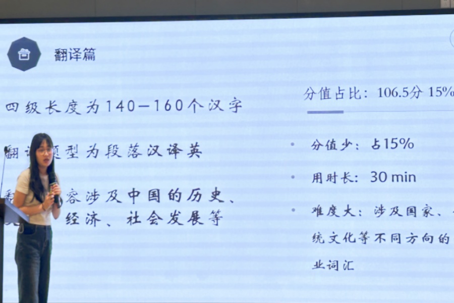 潘文晗分析了大学英语四六级翻译与写作真题的出题趋势和重难点,并提出了相应的复习策略和学习方法。她认为同学们要学习与中国文化和国情相关的英文文章和节目,并加强对语法和词汇等英语基础知识的学习,提高“用英语讲好中国故事”的能力。