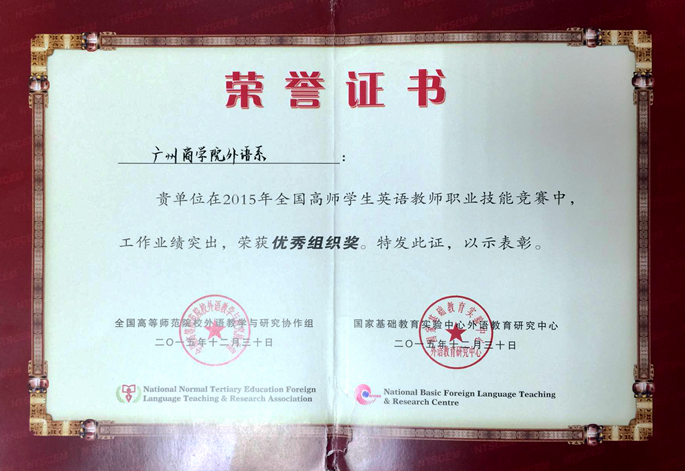 2015年11月,全国高师学生英语教师职业技能竞赛(以下简称全国高师竞赛)初赛在beat365官网顺利举行,共有150名学生参加,经过激烈的笔试,一级和二级分别有4人和9人进入决赛;决赛邀请了我系外语专业教授担任评委,比赛选手以说课的形式进行角逐,经过三个钟头的比拼,来自14级的黄美婷获得一级一等奖,来自12级的袁蔚亭与13级的吴茂莹并列获得一等奖。同时外语系也以有序的组织,良好的考风及专业的评审获得了主办单位的好评,被评为“优秀组织奖”。