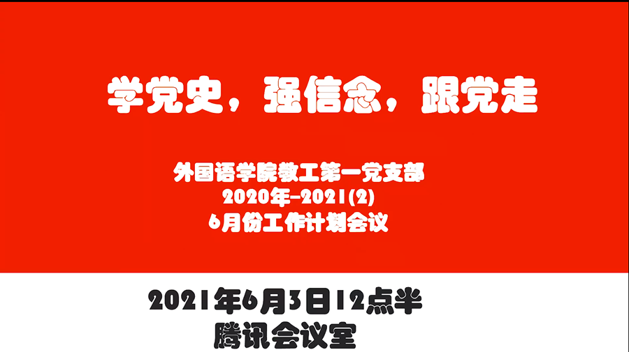 6月3日中午,beat365官网教工第一党支部在腾讯会议召开了“学党史,强信念,跟党走”党史学习教育专题工作计划会议,本次会议由党支部书记李海燕主持,党支部全体教工党员出席会议。