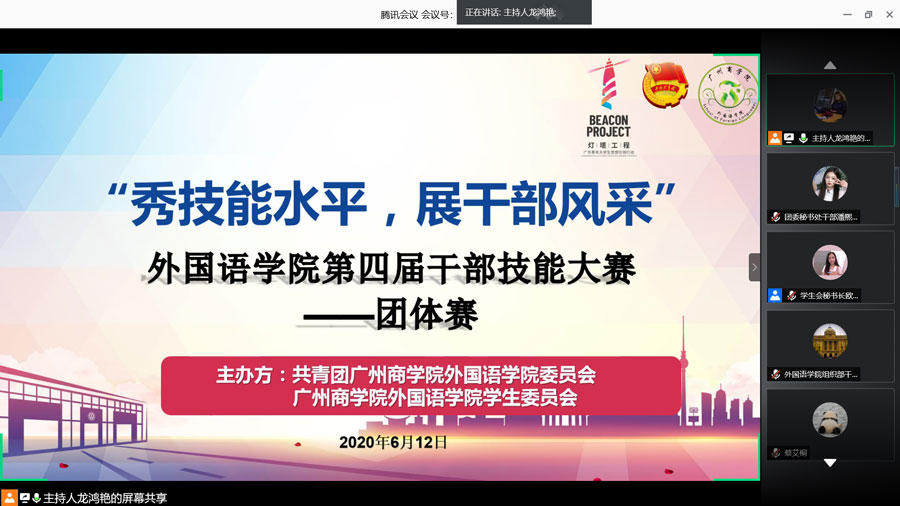 6月12日19:30beat365官网通过腾讯会议开展第四届干部技能大赛团体赛决赛,担任本次大赛评委的有院团委书记刘万里、院学生会指导老师伍思颖、团委副书记丁玮、团委组织部部长陈京华以及学生会主席黄雨珊,同时出席本次大会的嘉宾的有院17级辅导员刘丽老师、院17级辅导员黄士库老师、院19级辅导员刘丽萍老师以及院团委书记处和学生会主席团成员。