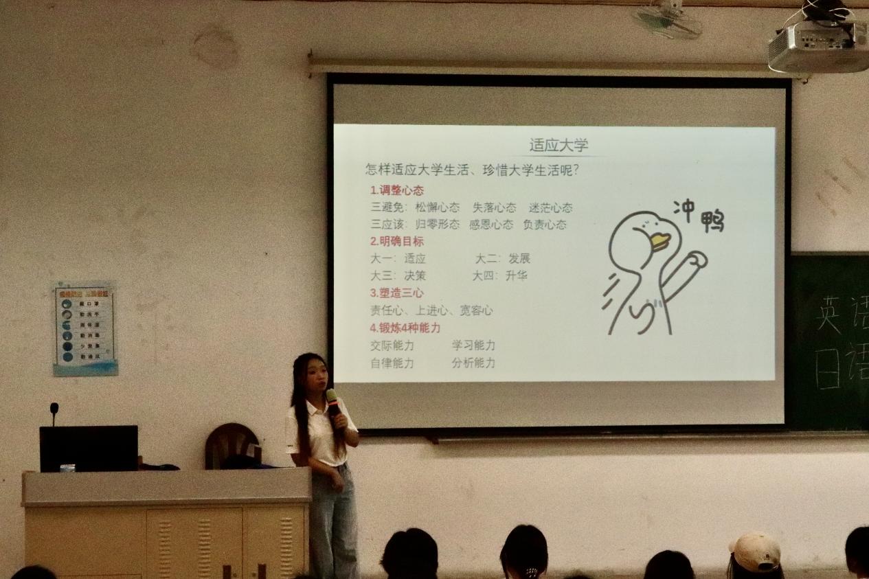 接着,辅导员解释了大学和高中教育的区别,让新生正确认识和了解大学,包括大学的规章制度、日常的活动、大学的各类奖项等等;辅导员强调,在大学也要认真学习,合理规划时间,充实自己,找到属于自己的生活方式,确定好人生目标,做到脚踏实地,一步一脚印。辅导员搬出四大法宝,一是调整心态;二是明确目标;三是塑造责任心、上进心和宽容心;四是锻炼交际、学习、自律、分析,帮助新生快速适应大学生活,珍惜大学的每一寸光阴。