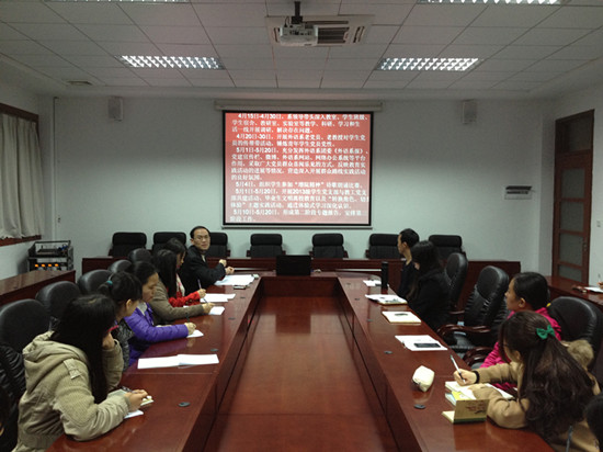 为深入开展党的群众路线教育实践活动,我系于3月12日12:15,在第二行政楼308召开动员大会。外语系党总支书记徐超、10级辅导员刘万里、11级辅导员刘丽萍、12级辅导员黄玉亭、13级辅导员雷肖茹、各学生党支部委员及三大组织核心干部参加了会议,会议由徐超主持。