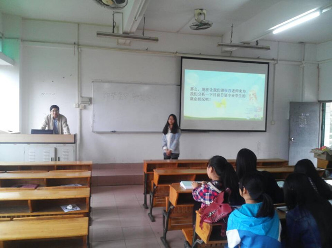 为使同学对自己未来的专业学习和职业方向有明确的规划,11月5日8:20我系2012级日语A班在B205召开了“仰望星空,脚踏实地”主题班会,我系日语研究室负责人张烈老师和日语A班全体同学参加了本次会议。班会由学习委员蔡嘉敏主持。