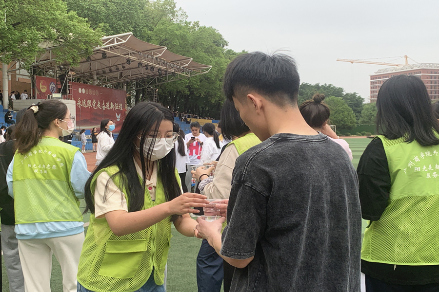 在体测开始前,21级学生党支部在21级学生党支部书记李超的组织下有序集合,设立服务岗,并完成志愿服务前的准备工作。同学们摆好姿势,做好准备,随着枪声一响,全力冲刺!在体测进行时,志愿者们来回奔波于服务岗和跑道之间,他们及时为完成体测的同学送上葡萄糖水、纸巾等物资,搀扶体力不支的同学到休息处进行放松调整。