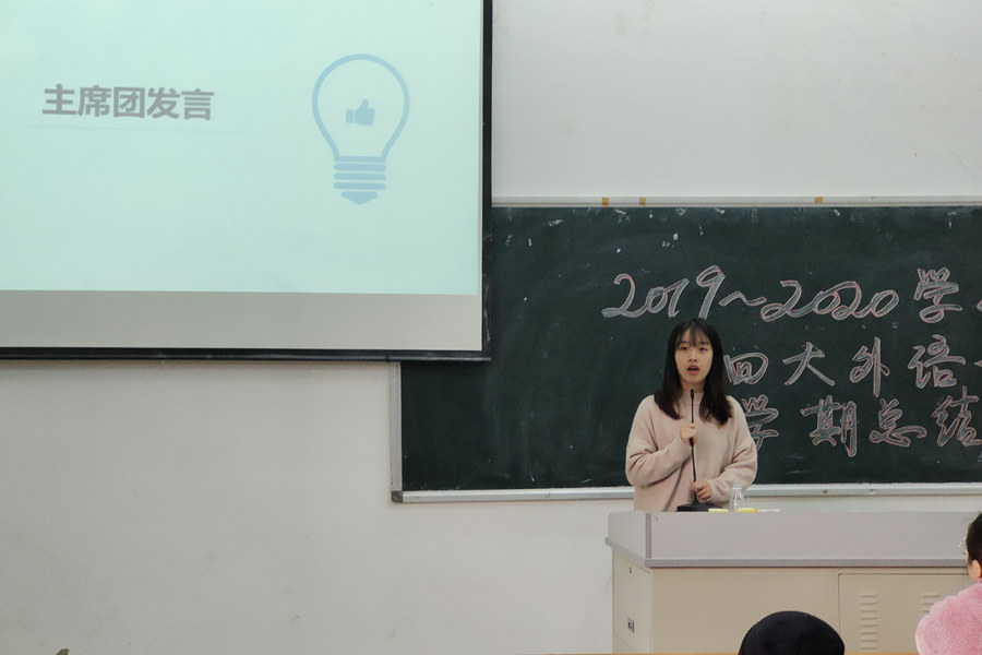 在四大外语协会汇报完毕后,学生会学习部副部长陈冰总结了本学期本学习部在对接协会中的不足之处,以及各协会工作中出现的问题。更是针对推文发布不及时,观摩协会活动次数不足等问题提出了一些建议。