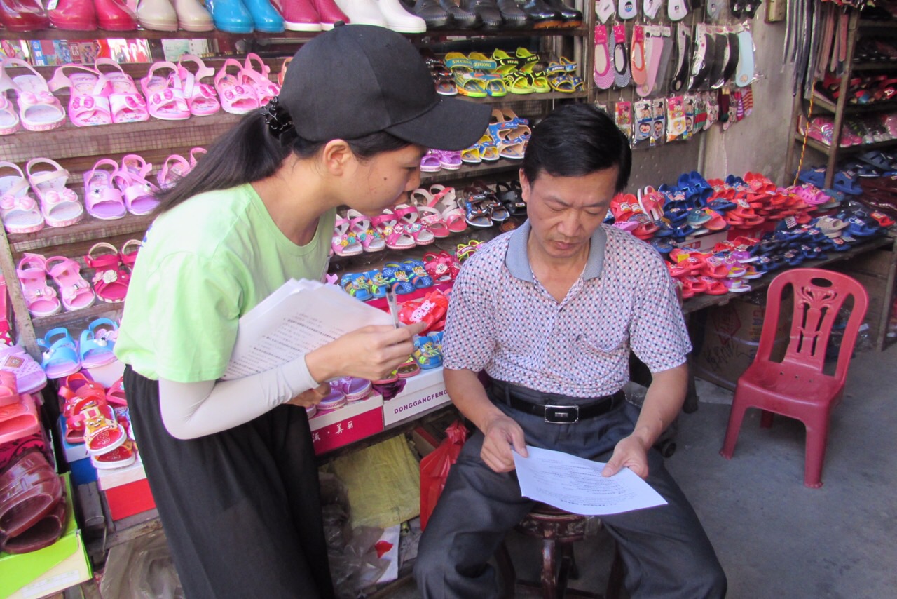 志愿者们沿着新铺镇中心街扩散到各个村落,走访了十几家商铺,有上百号人参与其中,他们认真耐心地配合调查,个别专业人士对古民居的开发、利用情况进行补充讲解,久居在新铺镇的村民对新铺古民居的开发、利用方面的主题调研饶有兴趣,纷纷对此发表了自己的观点。在这个过程中,不仅扩大了志愿者们的知识面,而且侧面反映了当地村民对当地传统的重视与传承。接下来,志愿者们在沿街采访居民时,当问及古民居拆迁问题的出发点时,各有不同的看法,但契合点都是为了维护当地的传统建筑文化与紧随经济发展步伐。最后志愿者们采访了一位已步入耄耋之年的老中医,他见证了新铺镇历史的变迁,对如何做好促进新铺镇的保护及开发措施的问题进行详细的阐述。从他身上,我们看到了老人对传统建筑的维护和热爱,这也增强了新一代青年对继承和弘扬优秀传统文化的决心。