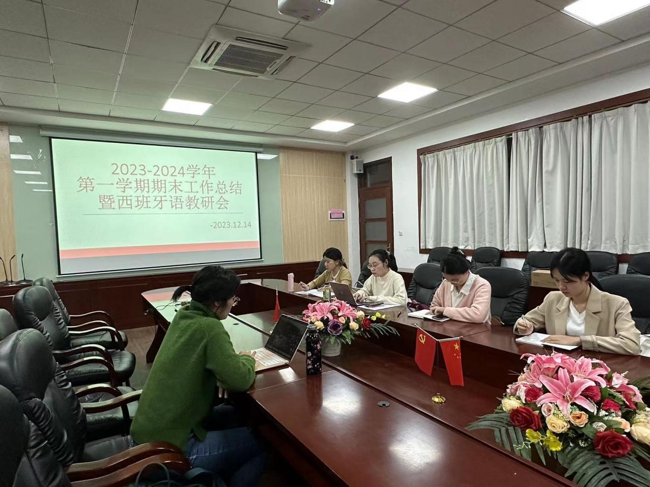 首先,西语系全体老师围绕2023-2024学年第一学期教学进度、课堂情况、国际交流、学科竞赛等工作进行总结汇报,随后老师们就本期末学生中出现的问题进行了深入的交流和探讨,总结了问题的类型,并讨论提升学生学习兴趣及学习能力提供新思路、新方法。