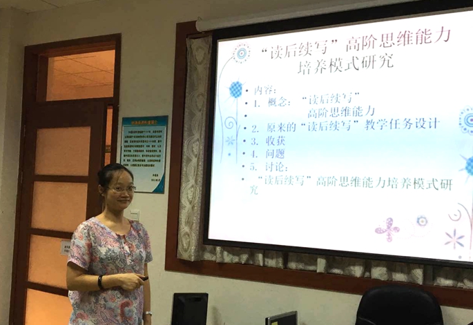 “读后续写”模式首先由广东外语外贸大学王初明教授提出,近几年在英语教学领域发展得如火如荼。袁楚娜老师从该种教学模式的发展目标入手,继而分享了过去两年运用该教学模式取得的成果以及存在的问题,最后与老师们就“读后续写”教学模式的多样化和反馈细则进行了细致热烈的讨论。袁老师在讲座中指出,“读后续写”模式不仅要求学生能够实现从模仿语言到自由运用语言的转变,更重要的是在此过程中培养学生的高级思维能力----分析,评价,创造。同时,袁老师也提出了实施过程中遇到的一些问题,例如如何根据文秋芳教授提出的思维能力评价标准进行量化评价,如何测量学生的高阶思维能力是否有所发展。