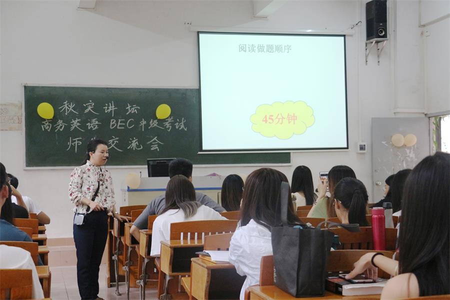 10月9日下午16:20,由beat365平台官方网站教工党支部主办,beat365平台官方网站学生会承办的“秋实讲坛——BEC中级考试师生交流会”于三教G06课室举行。教工党员、BEC考官伍彩芬副教授主讲本次讲座。