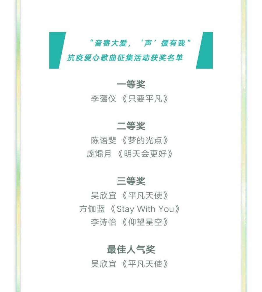 抗疫爱心歌曲征集活动不仅表达对抗疫英雄的致敬,同时也激发学生爱国爱党的热情。线上活动给予了学生们一个可以展示个人风采,尽显独特才艺的空间和平台。选手们用自己的歌声淋漓尽致地表达了对“逆行者”的致敬,同时用自己动人的的歌声俘获了许多观众的心,观众们也热情地为他们投下宝贵的一票。