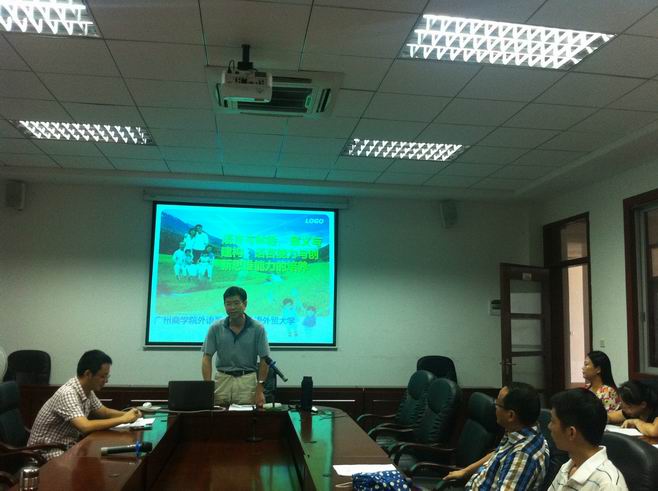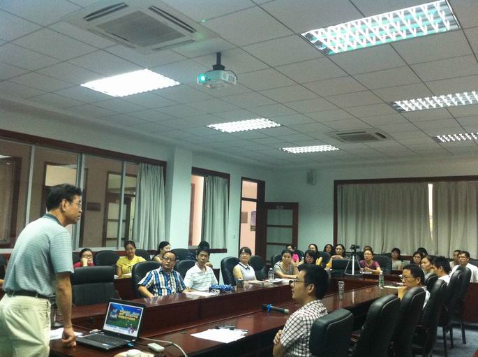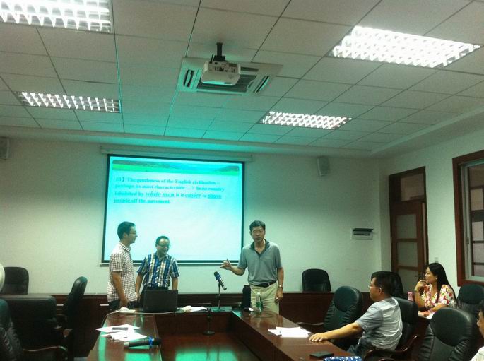 曾利沙教授为大家讲解了自己所进行的研究:体验——建构融通式笔译教学法。他从2004年起即对此教学法进行研究,迄今已积累了丰富的教学与科研经验。他用大量生动的实例语料为各位教师们讲解了体验式教学法的教学特点及其翻译课程中的应用。曾教授列举了“介词的情景化体验性”、“量词的义素特征和情景化体验性”等应用解析,并邀请老师现场演绎所讲解的场景。曾教授生动的讲解、清晰的理论、新颖的视角使在座的各位教师深受启发,回味无穷。