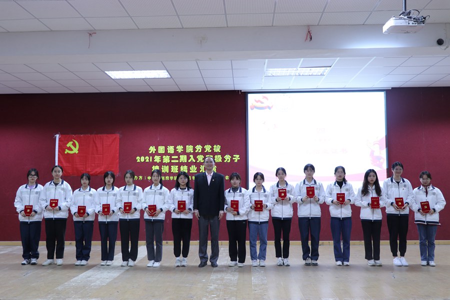 在慷慨激昂的国歌中,结业典礼正式拉开序幕。典礼上,全体成员一同观看了本期培训班的回顾视频,重温了培训班的学习课程、红色电影鉴赏、读书分享会等活动,展现了学员们昂扬向上的精神面貌,表达了学员们坚定不移的入党初心。接着,徐超书记向顺利结业的学员们表示热烈祝贺,并向学员们提出四点要求。首先,革命理想高于天。中国共产党从诞生之日起就把马克思主义写在自己的旗帜上,把实现共产主义确立为最高理想。我们党之所以能历经百年而风华正茂、饱经磨难而生生不息,就是因为内心中有强大的信仰,心怀坚定的理想信念。我们要坚定这份信仰、坚定这份信念、坚定这份忠诚。其次,主动学习贯彻党的十九届六中全会精神,用先进的理论武装头脑,提高思想政治觉悟水平。第三,“纸上得来终觉浅,绝知此事要躬行”,徐超书记勉励全体学员要进一步加强社会志愿服务,在思想和行动上入党,以实际行动践行“全心全意为人民服务”的宗旨。第四,进一步发挥先锋模范作用,党员不是一种荣誉或称号,而是代表服务与奉献的责任与担当。最后,徐超书记强调,培训班虽然告一段落,但结业不等于结束,在场积极分子要以终为始,把本次党课学习作为人生进步新的阶梯、自身成长新的起点,踏入新征程,满载起航。