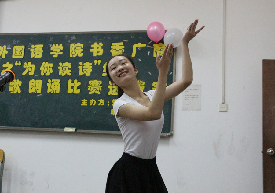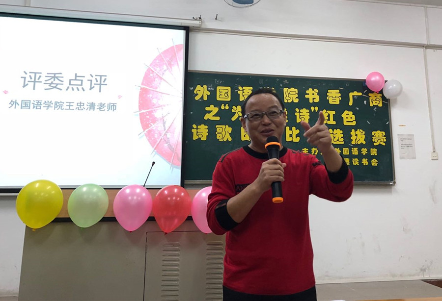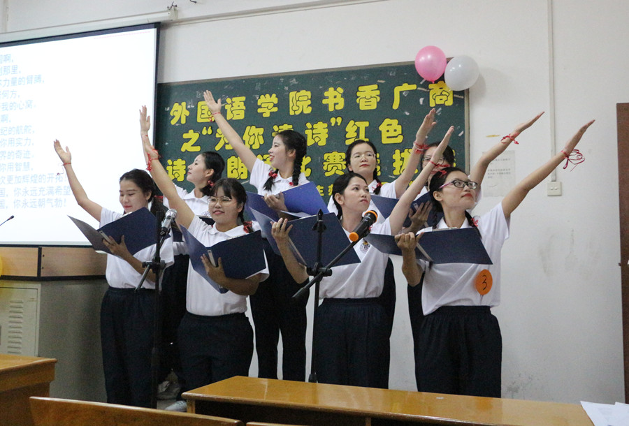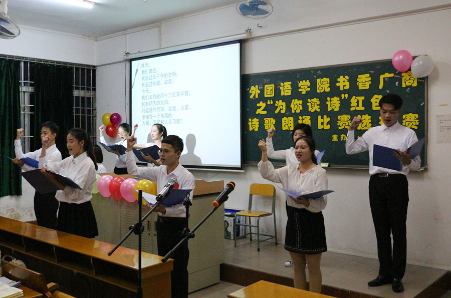 为响应beat365官网构建“书香广商”活动号召,为培养学生的诗歌阅读习惯、提高学生的红色文化修养,11月19日19:00,beat365官网书香广商之“为你读诗”红色诗歌朗诵比赛选拔赛在第五教学楼205举行。beat365官网大学英语部老师王忠清、2016级辅导员黄玉亭、学生会主席曾繁慧担任比赛的评委。学生会指导老师郑灿玲、2016级辅导员戴玮和将近120多名学生相聚一堂,一同品味红色诗歌中的革命人生,欣赏诗歌文化的语言魅力,聆听参赛作品的豪言壮志。