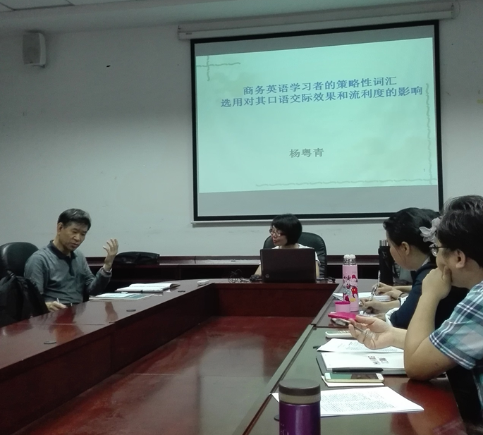 会议先由杨粤青老师分享自己的选题,她以“商务英语学习者的策略性词汇选用对其口语交际效果和流利度的影响”为题,作了陈述。在商务英语词汇和口语交际这两方面,杨老师有着多年的丰富经验,把她在教授商务英语学生过程中发现的问题,以及词汇的选用对学生口语交际产生的影响讲得非常清楚。杨老师发现,有的学生在词汇量测试中获得很高的成绩,这些学生的读、写能力都很不错;然而,大部分这些学生仍然发觉有效英语口语交际很困难。如何积累商务英语词汇并在交际中有效运用,是口语交际方面的研究重点。交际策略意识和运用在教学和二语习得领域得到了越来越多研究。在座老师在听的过程中,也产生了很多共鸣。